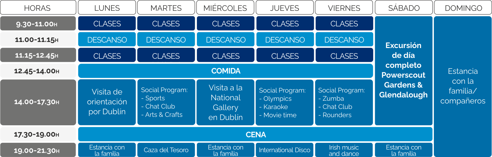 Después de las comidas el alumnado disfrutará de un variado programa que incluye visita guiada por el centro de Dublín, Gymkhanas, actividades deportivas, Arts & Crafts o actividades de equipo con estudiantes de diferentes nacionalidades.