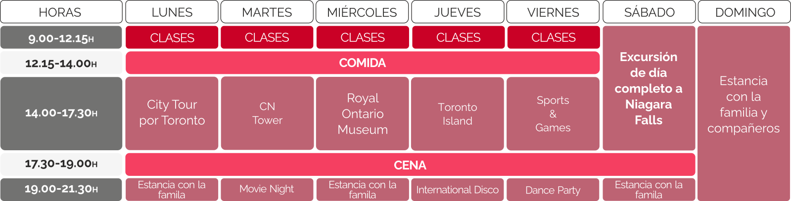 as tardes se dedican a actividades variadas que combinan cultura, deporte y ocio. El alumnado podrá descubrir algunos de los lugares más emblemáticos de Toronto: la CN Tower, el Royal Ontario Museum, Toronto Island, los barrios más representativos y otros espacios clave de la ciudad.