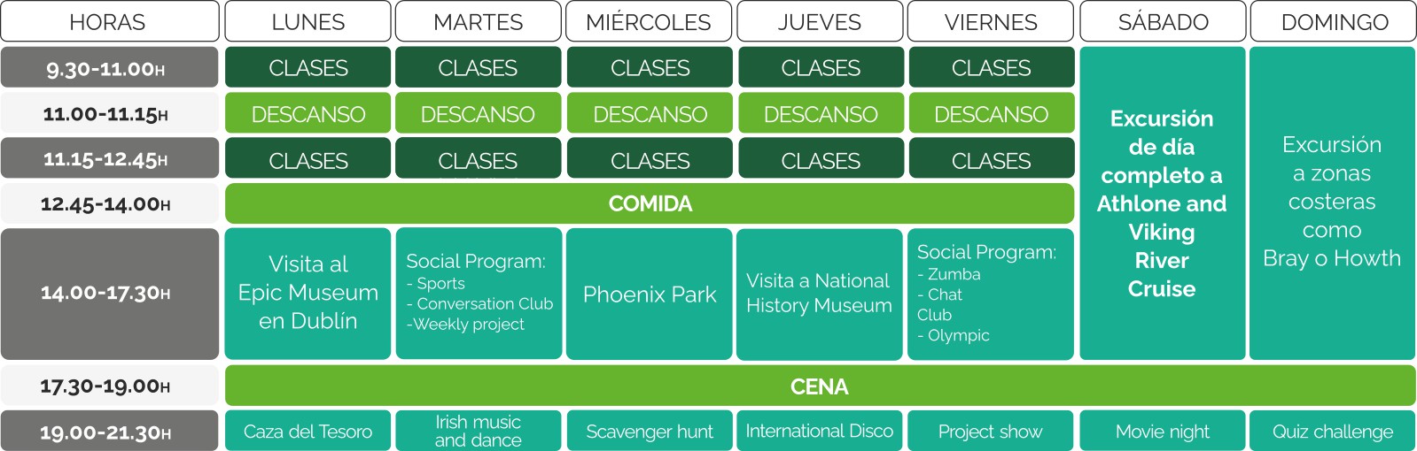 Disfrutarán además de 2-3 excursiones de medio día por semana donde podrán disfrutar de algunos de los lugares más representativos de Dublín, como el Trinity College, Phoenix Park, National Art Gallery, The Spire, Graffton Street, etc.